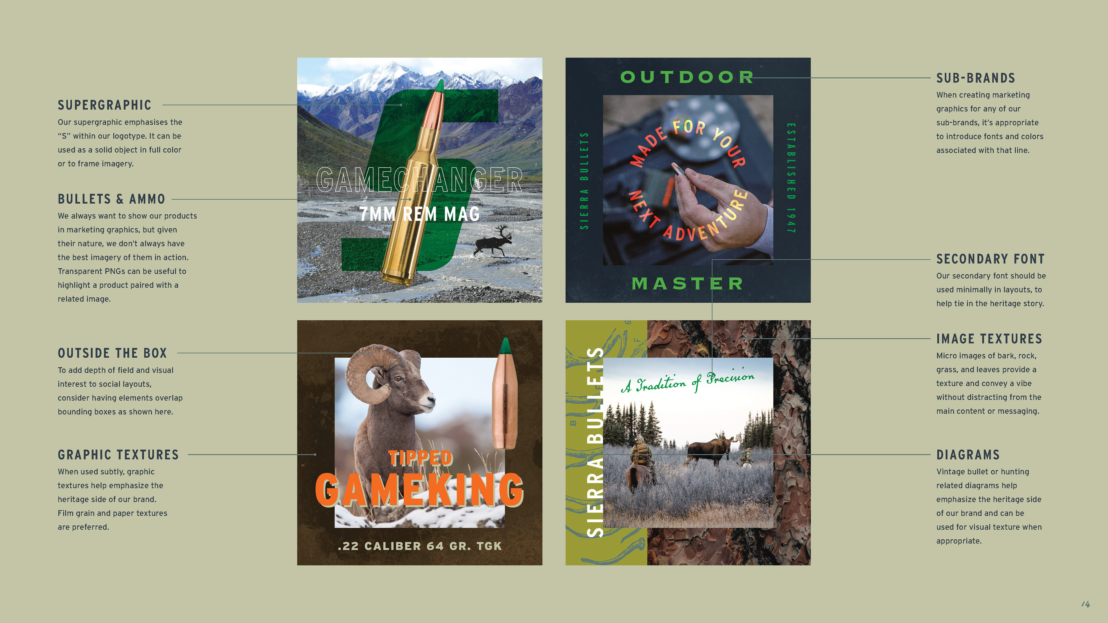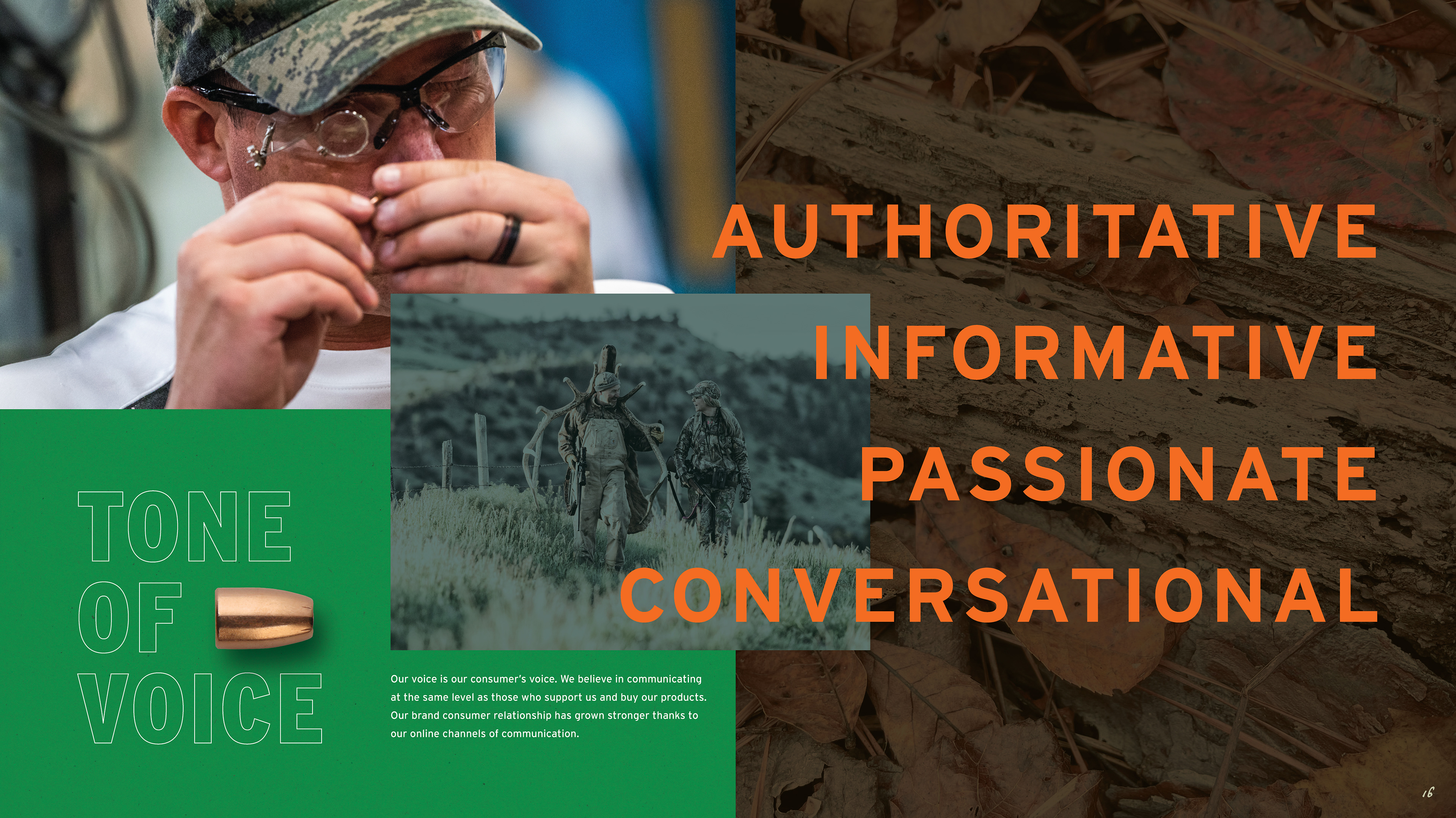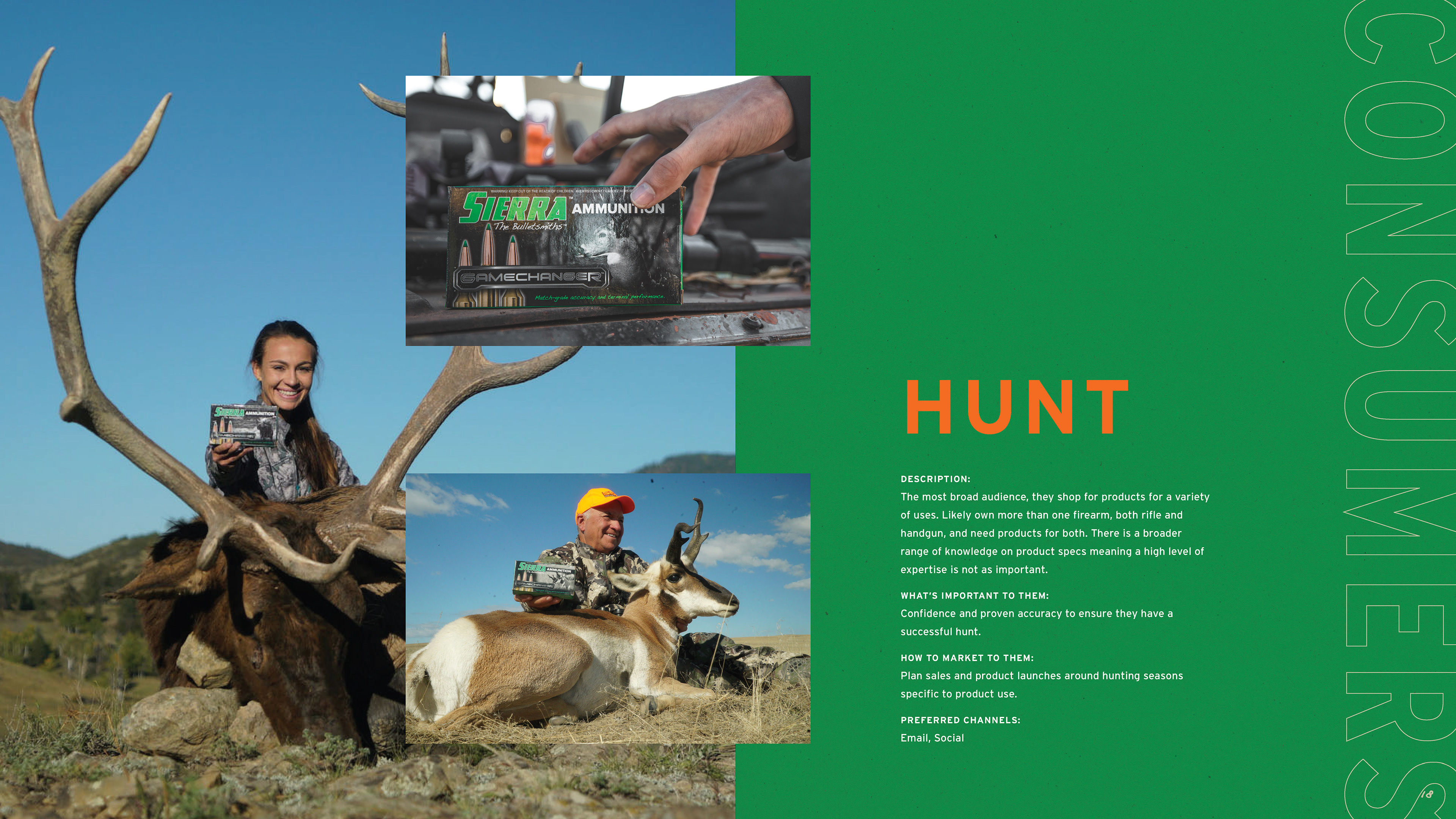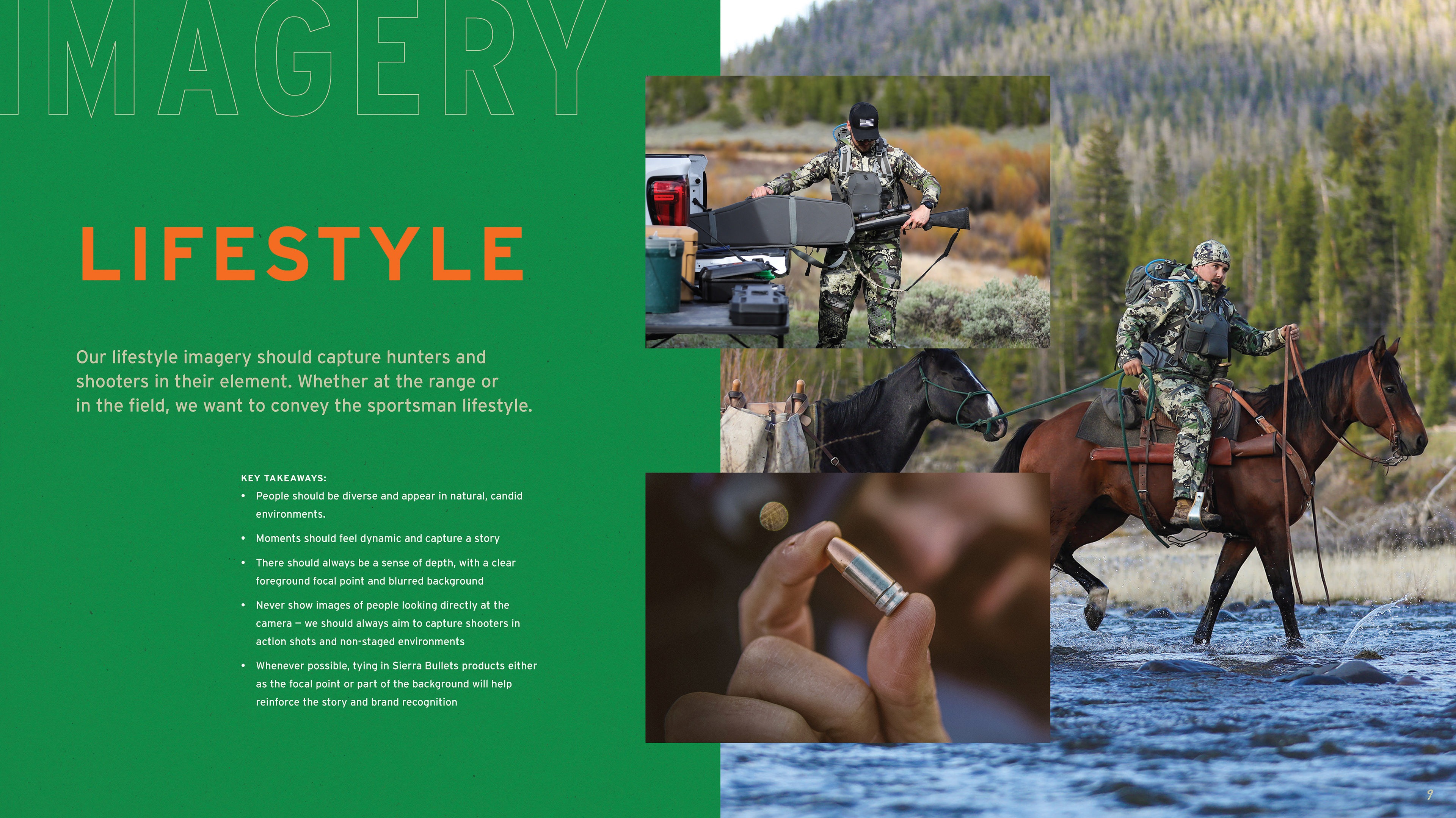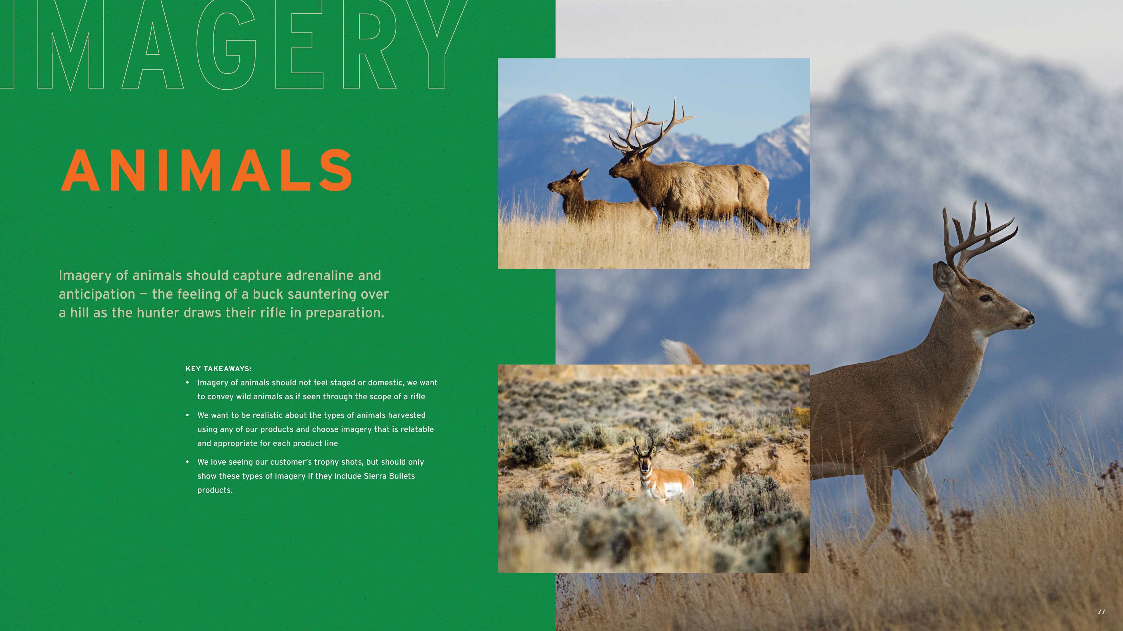 The work began in 2019 with packaging and website updates, project by project, product line by product line. As the work demonstrated what the brand was capable of, the scope expanded. What started as individual packaging assignments eventually led to a full brand guidelines document — one that codified the complete visual language of Sierra: logo standards, a color palette drawn from the natural landscape the brand's consumers inhabit, a typography system built for both heritage and performance contexts, and three distinct imagery categories — lifestyle, landscapes, and animals — each with detailed direction for how to shoot and select photography. Beyond visuals, the guide defined Sierra's tone of voice and mapped three core consumer personas: Compete, Hunt, and Defend, each with distinct needs, motivations, and preferred channels.