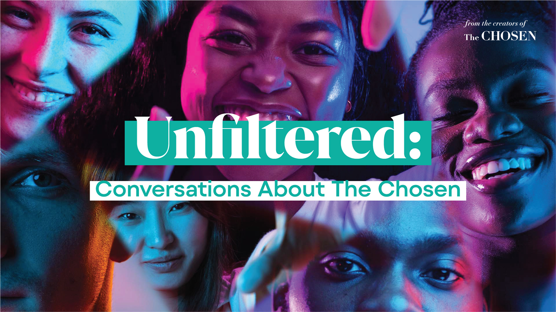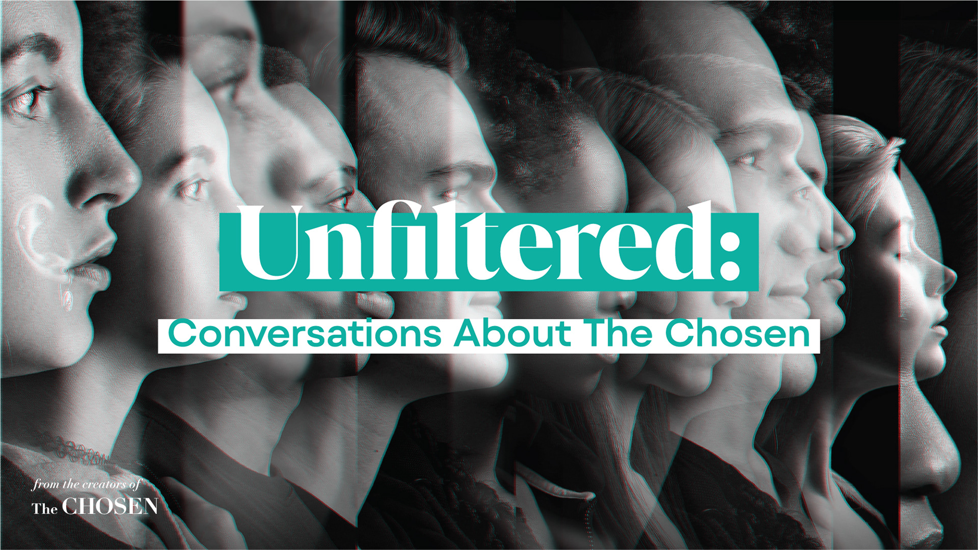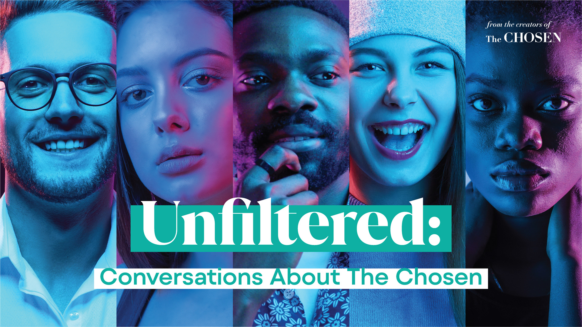 The creative brief was clear: reach a younger audience, and don't soften the contrast to get there. But the real design challenge ran deeper than demographics. Unfiltered followed a group of Gen Z strangers — different backgrounds, different beliefs, one who had even left a cult — watching The Chosen for the first time and reacting honestly. The visual language needed to carry that story. Every design decision was rooted in the idea of multiple perspectives colliding. The early concepting explored mirroring and layered image effects to capture the feeling of overlapping viewpoints. We eventually landed on a prismatic treatment — because religion, like light through a prism, is multifaceted. These were people who came into the experience as one thing and left as something different. The design needed to hold that transformation.